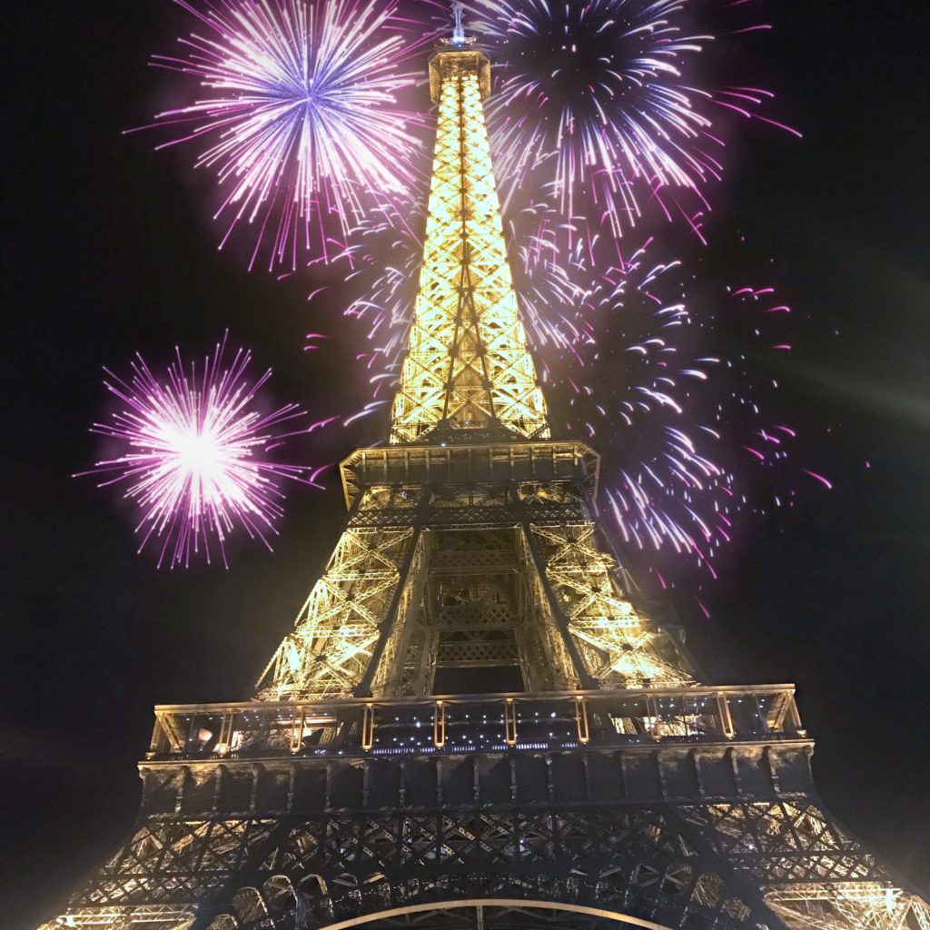 Alternative viewing platforms for the Eiffel Tower firework display are from a bridge, a terrace bar, or all the way up on the hill of Montmartre, in front of Sacré Coeur