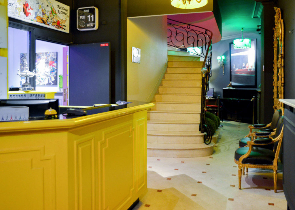 If you want to immerse yourself in the cool 3rd arrondissement, the Upper Marais, but don’t have the budget to stay at the Hôtel National des Arts & Métiers, nip around the corner and you’ll find the Hôtel de Roubaix, a gem in its own way. Run by a French accordionist whose mother bought the establishment in 1967, the Roubaix has been a hotel since 1861. It is now, happily, modernised, with happy being the operative word: it features colourful Pop Art on the wall and pops of brightly hued furniture. Behind the sweep of a staircase, edged in glamorous wrought iron, you’ll find a piano bar, the perfect spot to enjoy a final nightcap and tune or two.