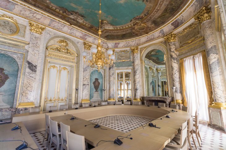 Do a tour of the various rooms, and make sure to keep a lookout for the Conseil d’État’s Salle du Tribunal des Conflits (pictured) — this oval-shaped salon, all a-glamour in marble, gold and trompe-l’oeil, is one of the oldest rooms, having been originally designed in the 1750s as the Duchesse d’Orléans’ dining room.