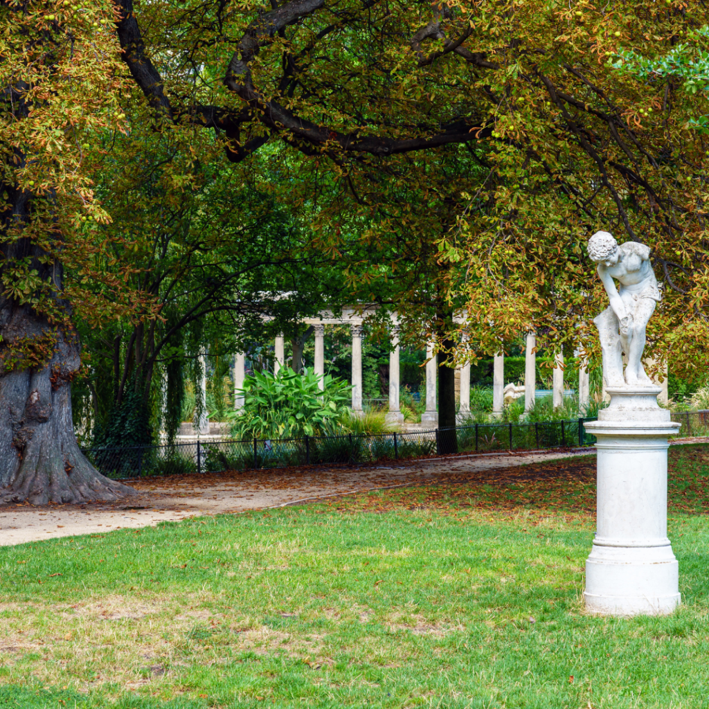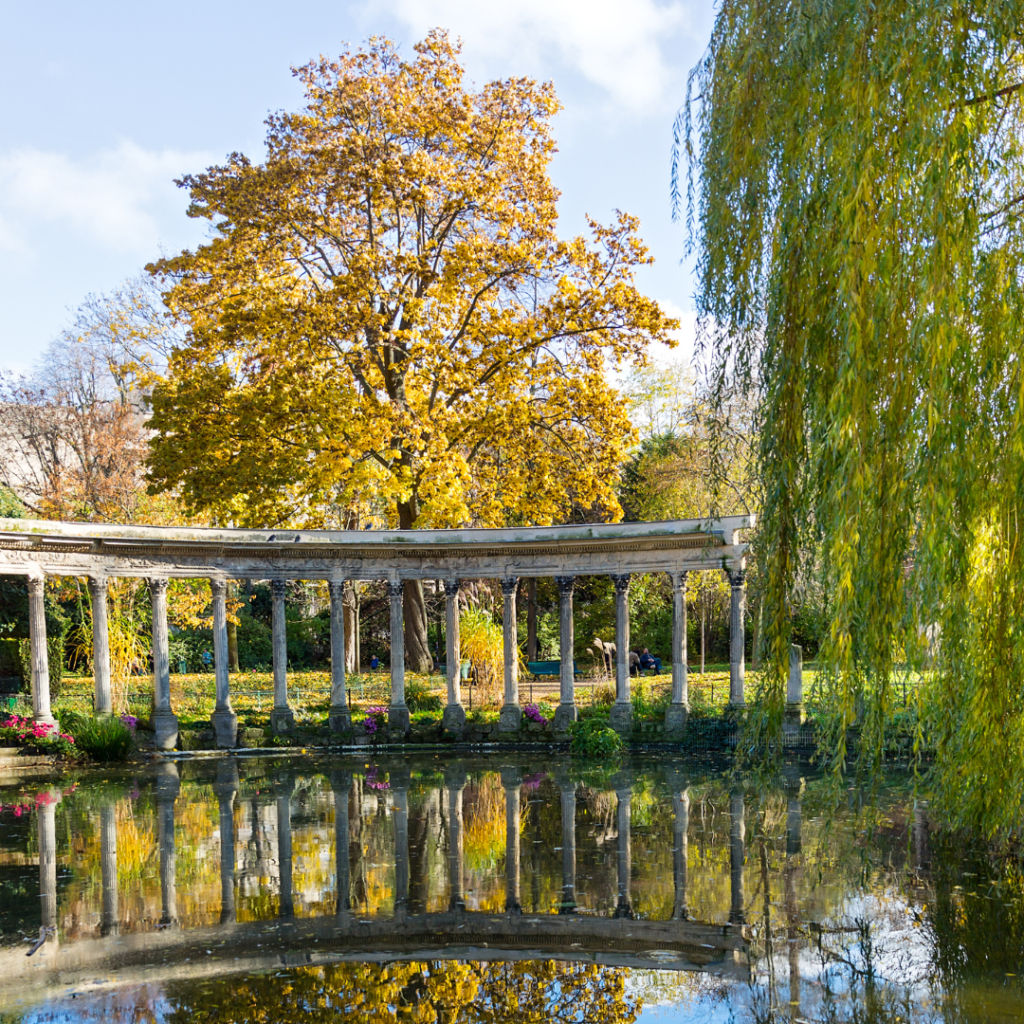 Some of the follies, dating from the park’s nineteenth-century development from a former aristocratic playground to a public space, were created to look old. Others actually are ancient. Curving around one end of Parc Monceau’s pond are Corinthian pillars, placed here by the garden’s original eighteenth-century designer, who repurposed them from a funeral chapel Catherine de Medici had commissioned in the late sixteenth century. In late autumn, the antique ruin appears all the lovelier and more fragile next to the delicate, yellowing leaves of the willow trees that also grace this pond.